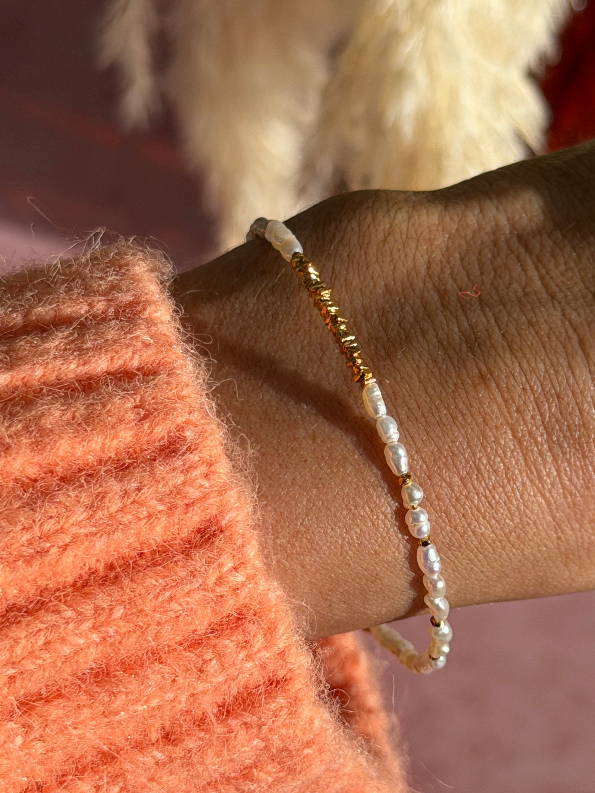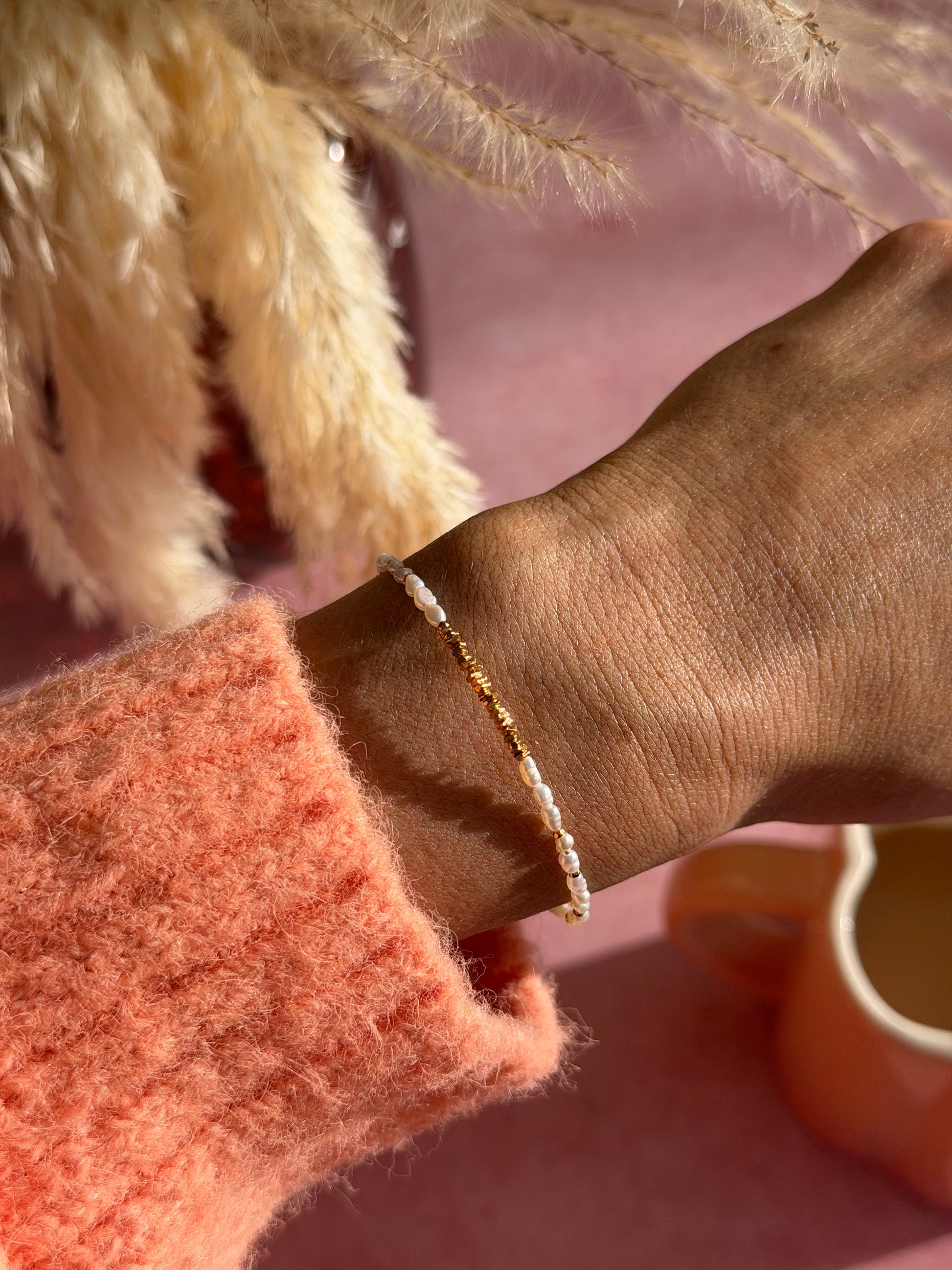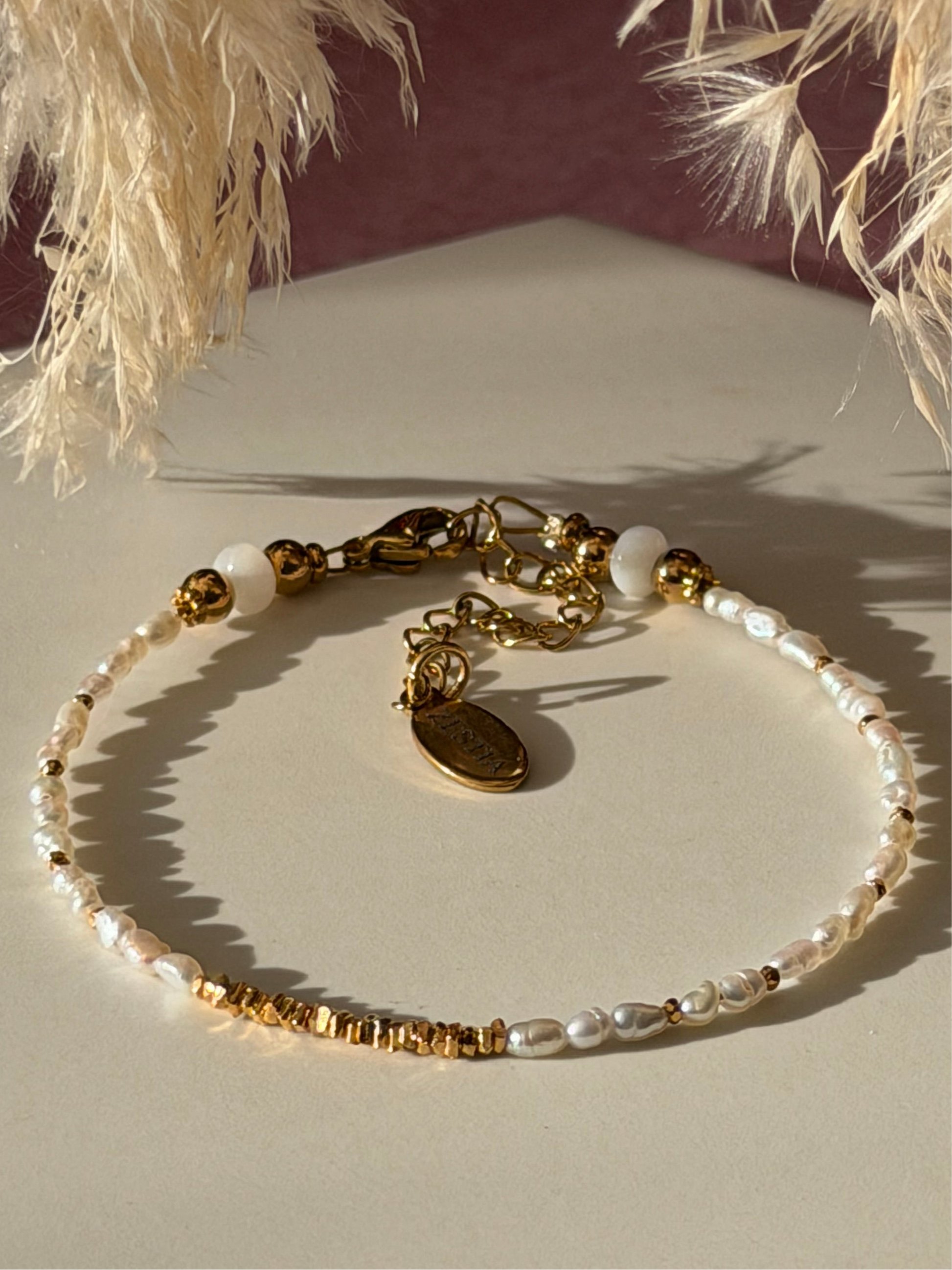 A delicate bracelet made entirely from freshwater pearls, finished with subtle gold accents that add warmth and depth. Soft in shine yet beautifully detailed, Celeste is understated, refined, and designed to be worn effortlessly every day.