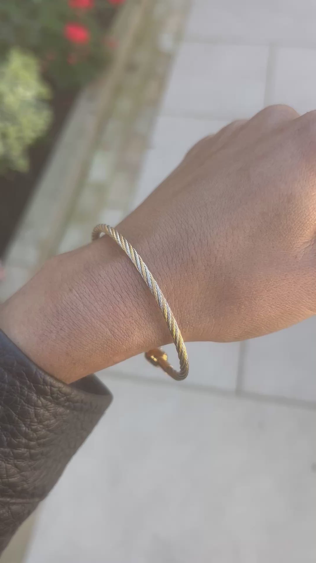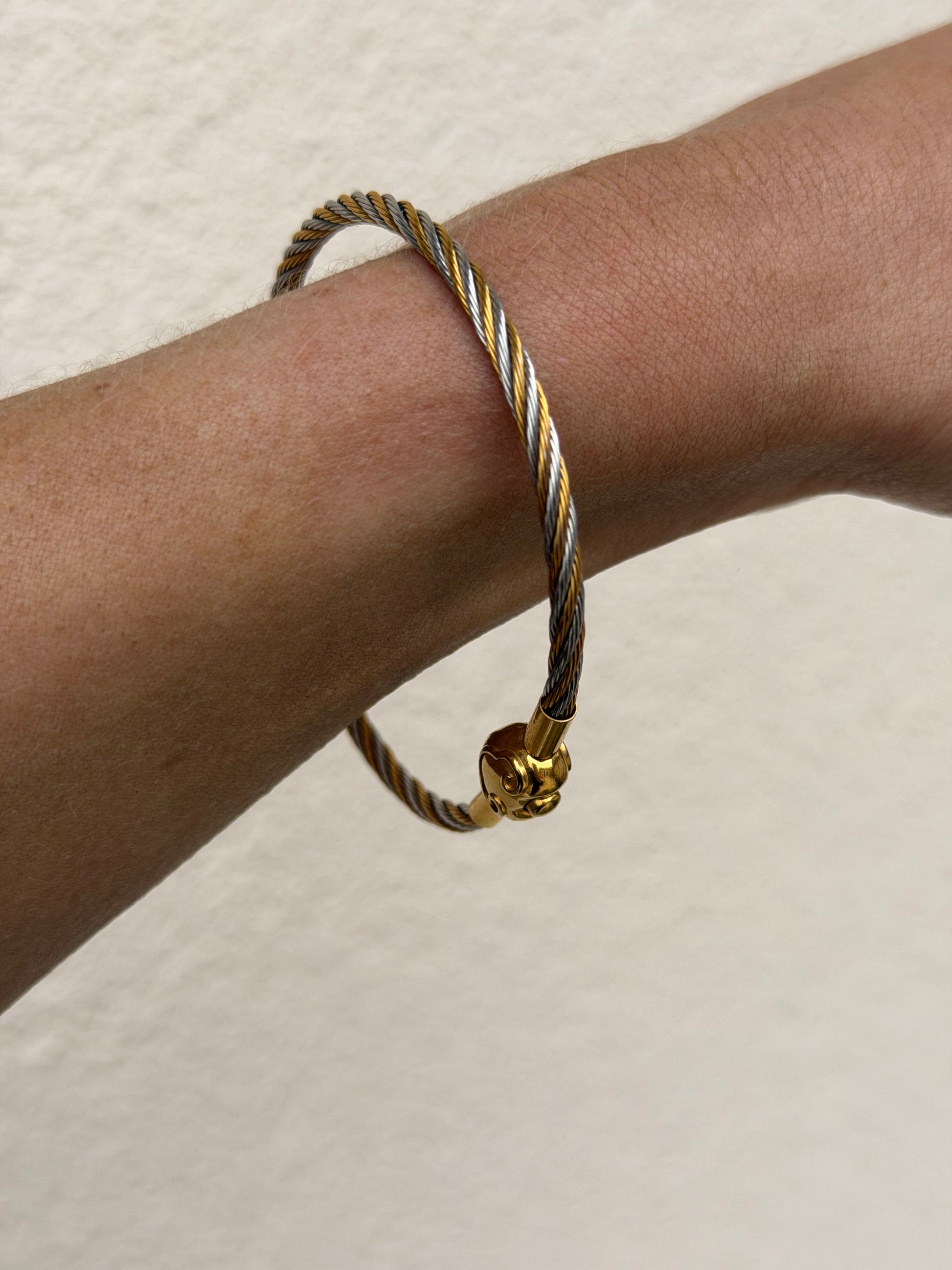 A sleek and stylish dual tone bracelet. It features a unique gold-tone clasp with elegant swirl detailing that locks securely, combining durability with timeless design. Perfect for everyday wear or as a statement accessory.