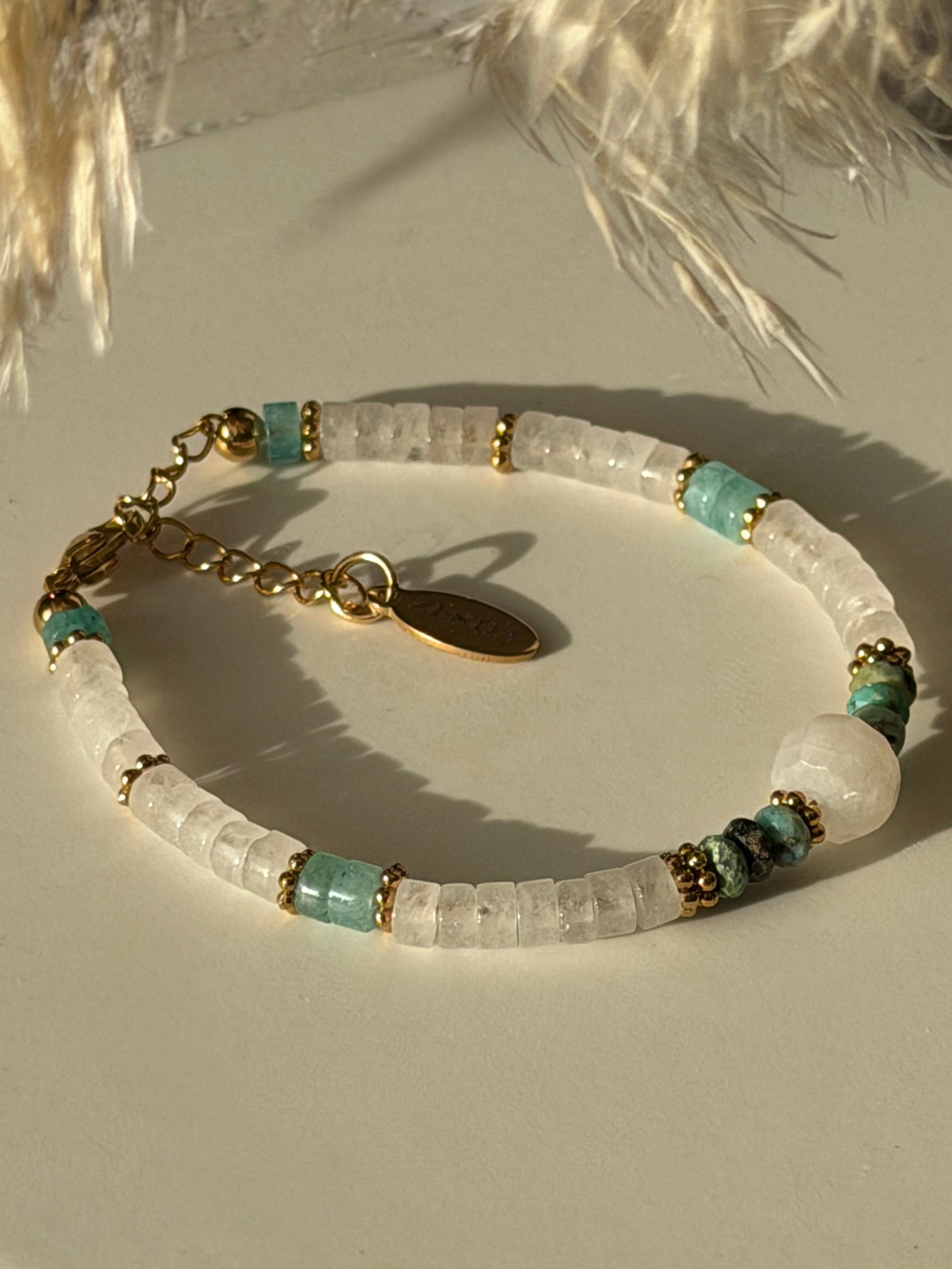 At the centre of ESRA sits a genuine moonstone gemstone, chosen for its soft, natural glow. It is paired with smooth moonstone rondelle beads and accented with blue-toned dyed quartz stones, adding a subtle wash of colour and contrast. Warm gold-toned spacers complete the design with understated detail.