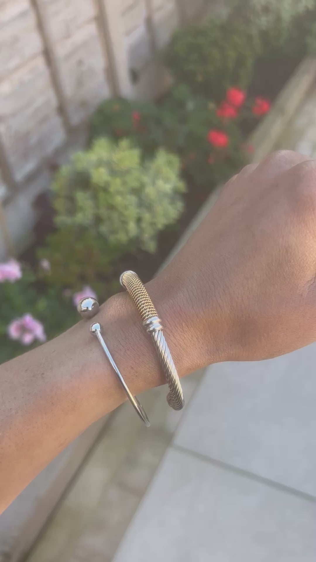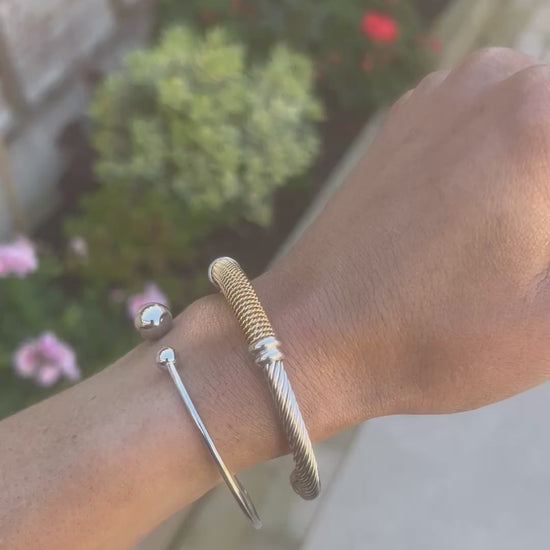 A refined cuff bracelet with a gold-tone mesh finish, accented by sleek silver tone ends. Its waterproof design makes it durable and easy to wear every day, while the flexible slip-on style ensures comfort and a secure fit. A versatile piece that pairs effortlessly with any outfit.