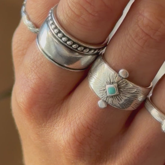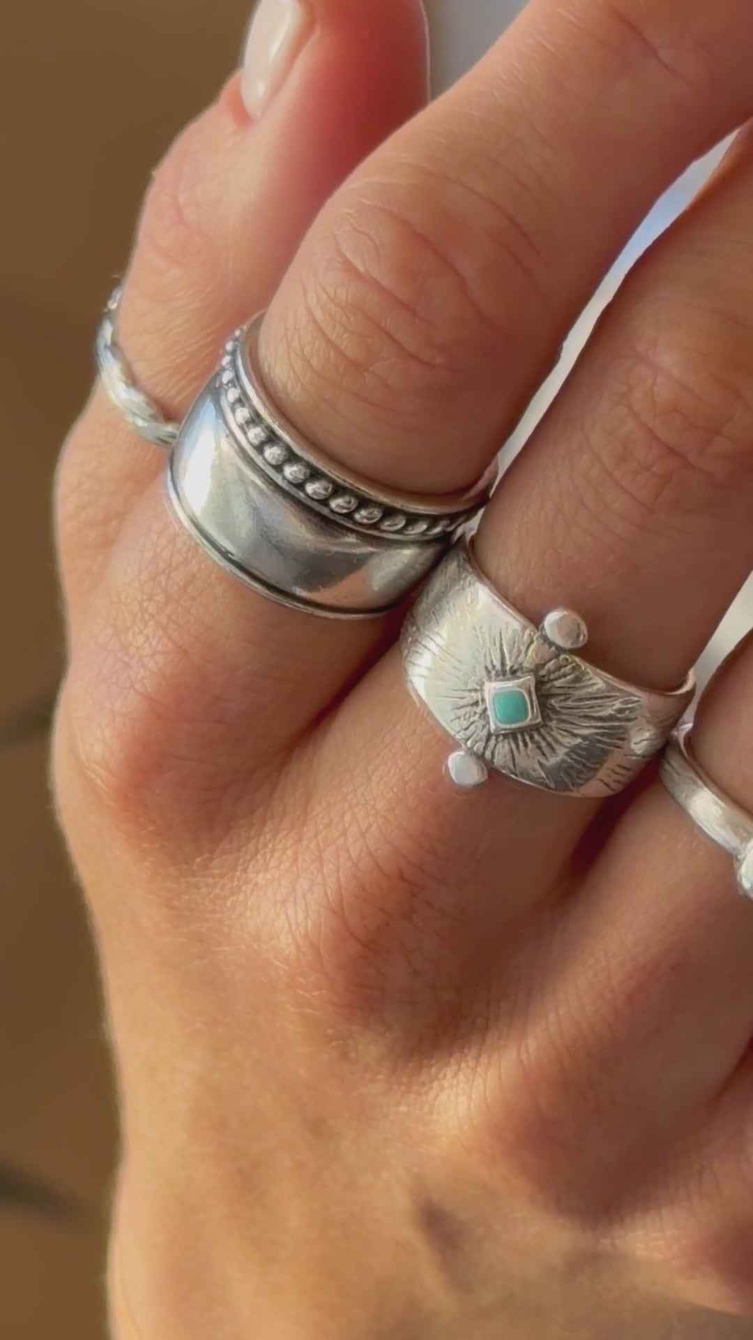 Handcrafted from pewter, this bold artisan ring features a textured sunburst design with a turquoise blue stone at the centre. Inspired by the bright skies and sea of the Greek islands, it’s a unique statement piece you can wear every day.