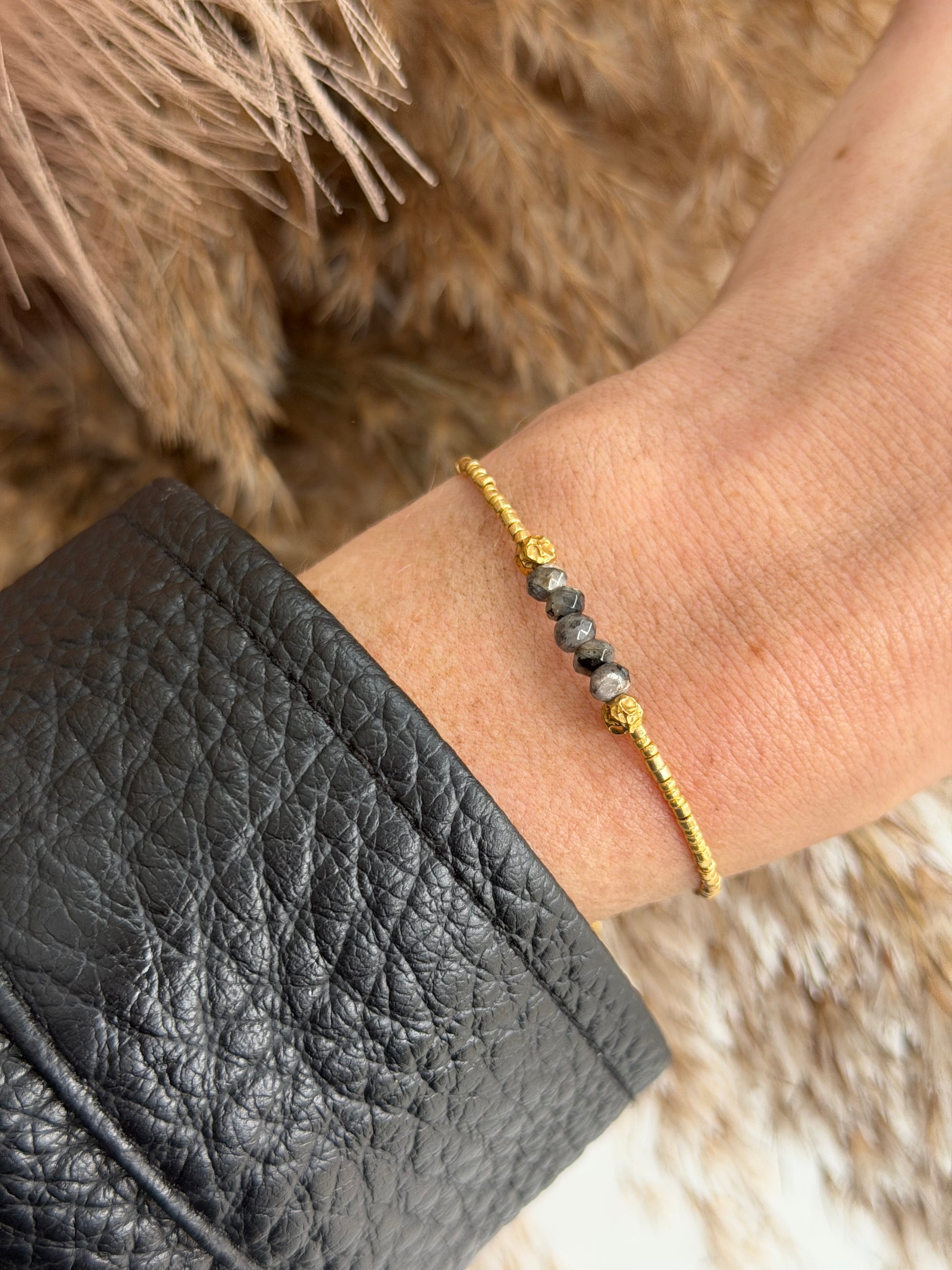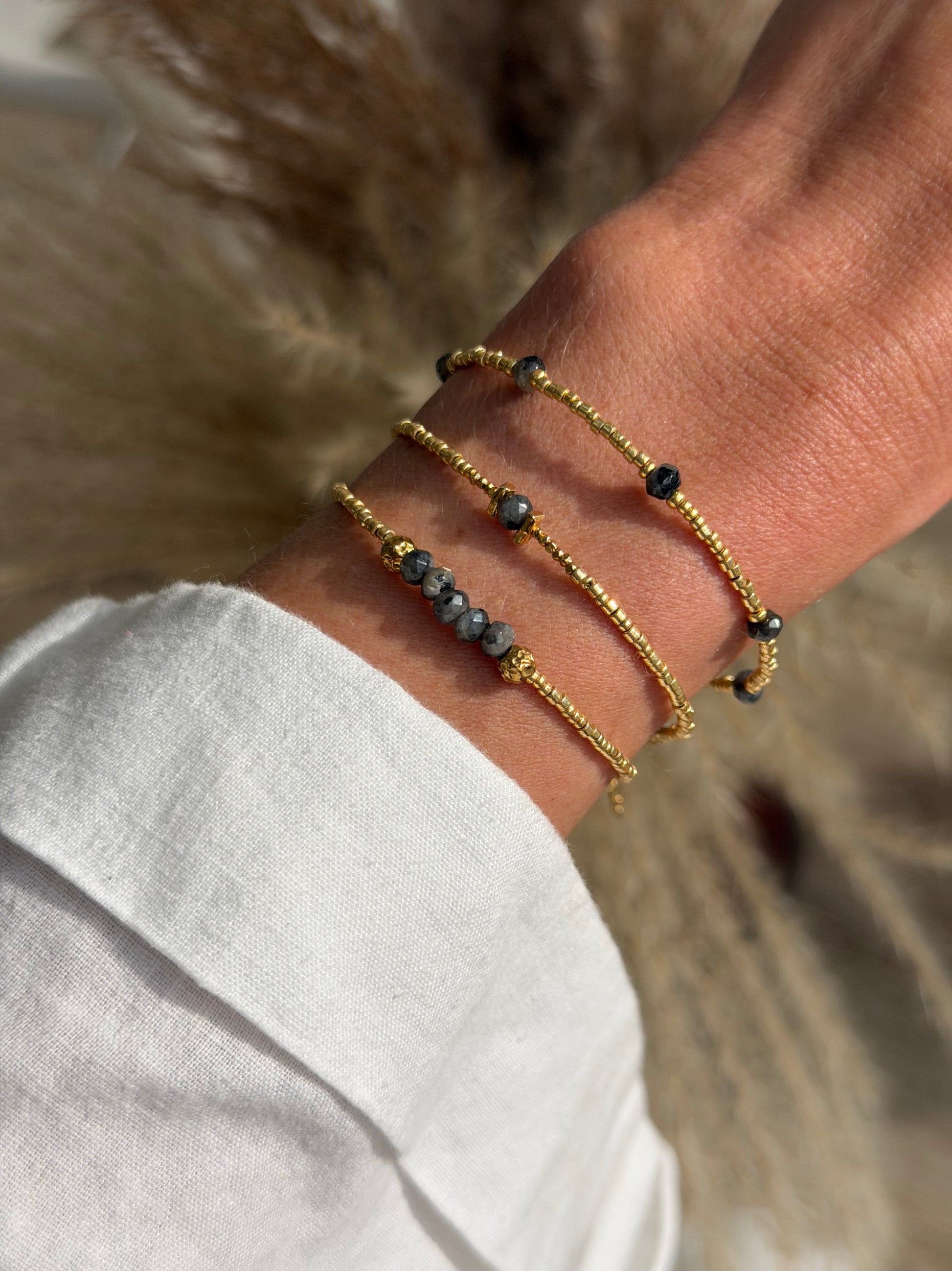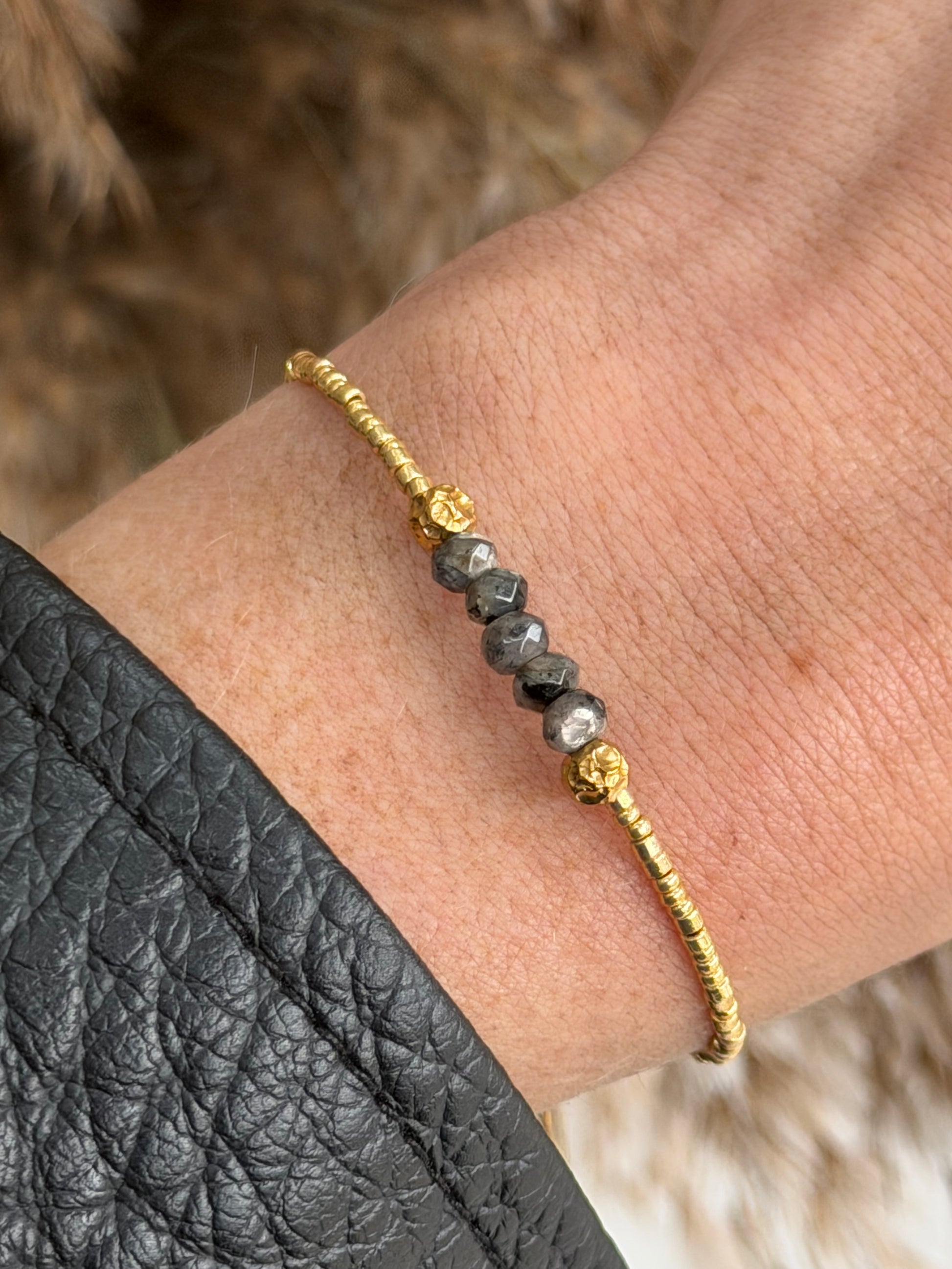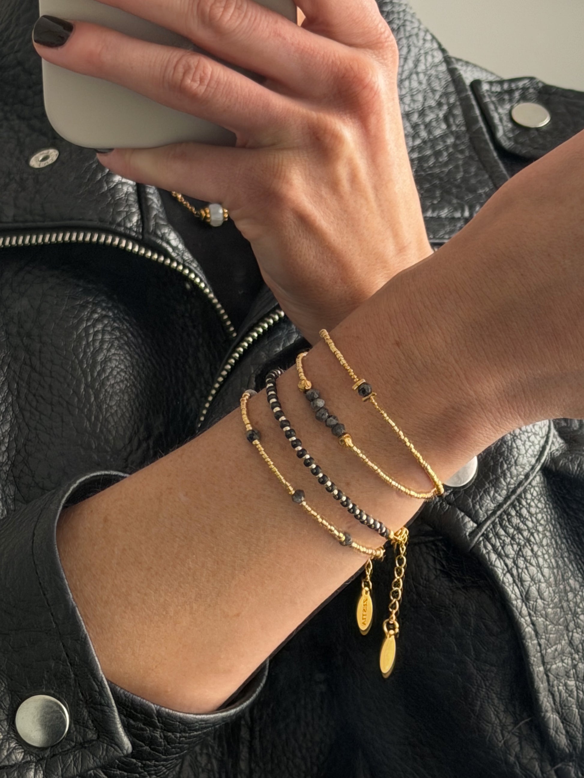 Rogue is a delicate gold bracelet finished with faceted dark stones for a subtle rock edge feel. Designed to be worn alone for a minimal statement or stacked for a layered look.