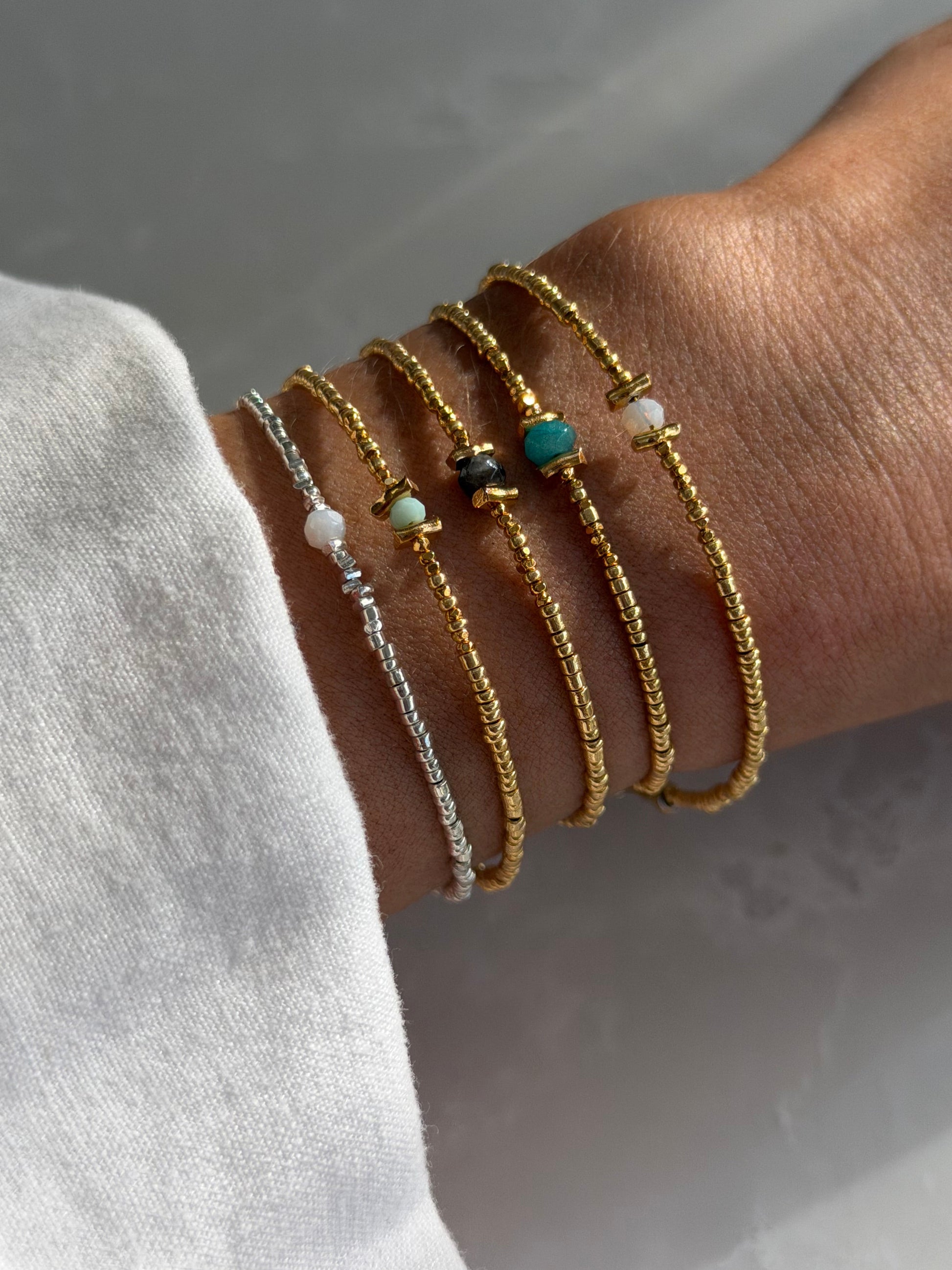 Featuring luminous glass beads with a subtle sheen, accented with polished metallic details for extra sparkle, each bracelet is finished with a beautiful central stone available in a range of carefully chosen colours, so you can pick the shade that suits your style.